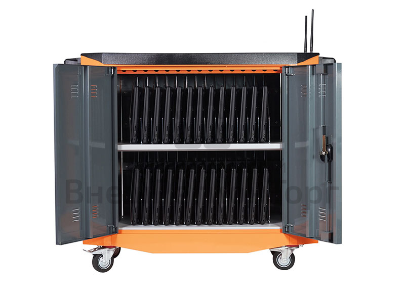 Внутри прочного корпуса размещены две полки с сетчатыми перегородками для расположения ноутбуков. Максимальное количество на каждой полке - 15 штук. Благодаря тому, что перегородки съемные, вы можете оптимизировать внутреннее пространство при меньшем числе ноутбуков. Отделение закрывается двумя дверьми с ригельным замком.