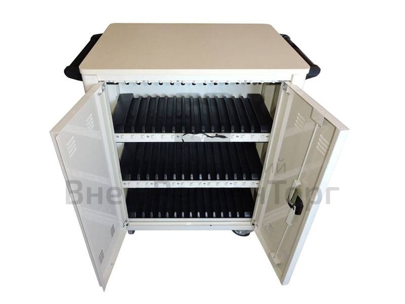 Передвижной сейф поставляется в собранном виде. Внутри корпуса располагаются четыре полки с пластиковыми ложементами для размещения планшетов (ячейка - 25 мм). Внутреннее отделение корпуса закрывается двумя дверьми с ригельным замком. Две средние и верхняя полки могут регулироваться по высоте в зависимости от размера планшета.