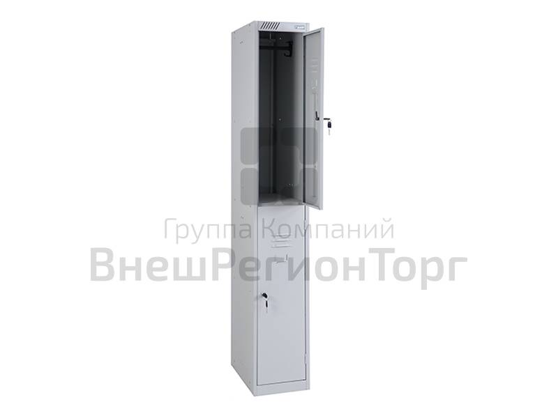 Одна секция шкафа разделена по высоте на два отделения. В каждом отделении два крючка для одежды и перекладина для вешалки, полок нет. Каждая распашная дверь имеет держатель под личную карточку, закрывается на почтовый замок повышенной секретности и имеет по два ключа.