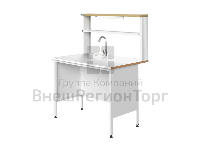 Ламинат - устойчив к кратковременному воздействию концентрированных кислот, щелочей, органических растворителей, дезинфицирующих растворов, красителей. Высокая устойчивость к истиранию. При кратковременном воздействии выдерживают температуру до +250С. Не меняет своих цветовых характеристик с течением времени. Материал гигиеничен, легко очищается. Цвет столешницы– белый.В столешницу врезана сливная раковина из полипропилена 250х100х150 мм, моно- кран. Каркас стола изготовлен из металлической профильной трубы квадратного сечения 30х30х1,5 мм. Боковые стенки изготовлены из металлического холоднокатаного листа толщиной 0,9-1 мм.