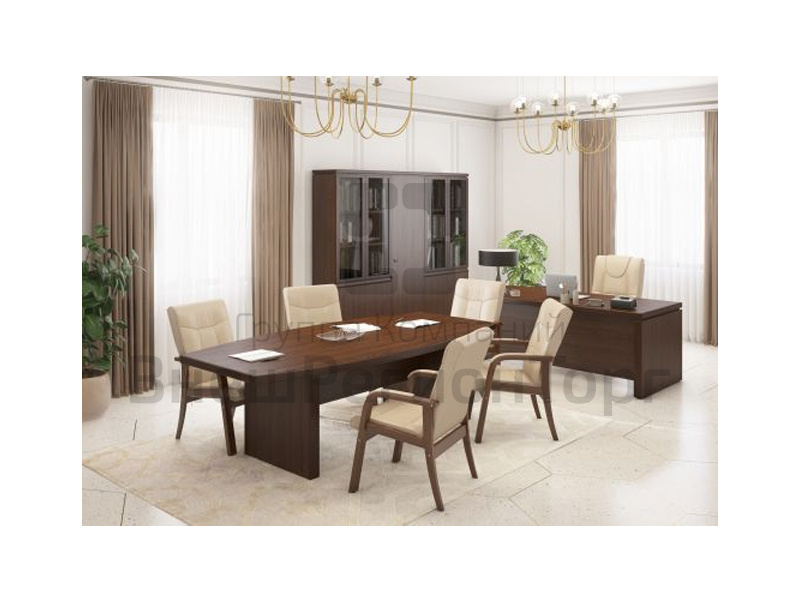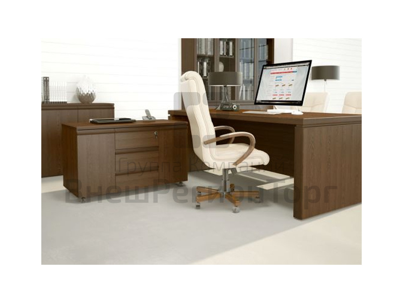 Данный комплект мебели представлен только в темном исполнении, что придает кабинету более статусный внешний вид. А массивные элементы стола, бифинг-приставки, шкафов и тумб лишь подчеркивают этот визуальный эффект.