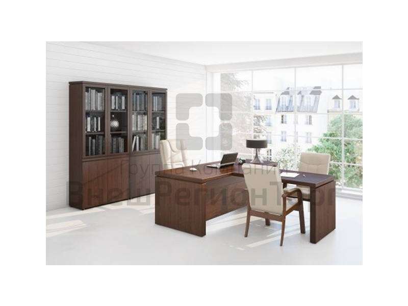 Данный комплект мебели представлен только в темном исполнении, что придает кабинету более статусный внешний вид. А массивные элементы стола, бифинг-приставки, шкафов и тумб лишь подчеркивают этот визуальный эффект.