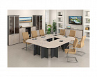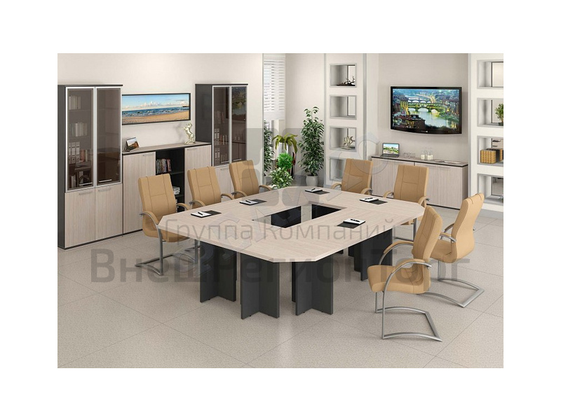 Рабочий стол может быть классическим прямым или со встроенной тумбой, иметь опоры из ЛДСП или на металлокаркасе. Брифинг-приставка также может иметь опоры из металлокаркаса или ЛДСП. Наличие отдельных секций в сервисной тумбе позволит разместить системный блок, сейф и другие вещи, которые должны быть всегда "под рукой".