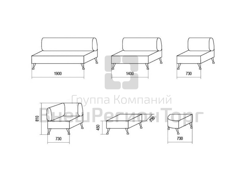 - Двухместную секцию без подлокотников 1400 х 730 х 810h мм., 0.83 м3 – 2 шт.;