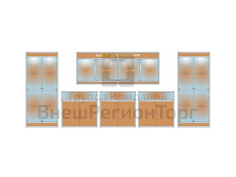 Комплект состоит из 1й настенной витрины с заголовком 2300х600х200 мм, 3х наклонных музейных витрин 1000х1000х450 мм и 2х высоких витрин 900х2100х450 мм.