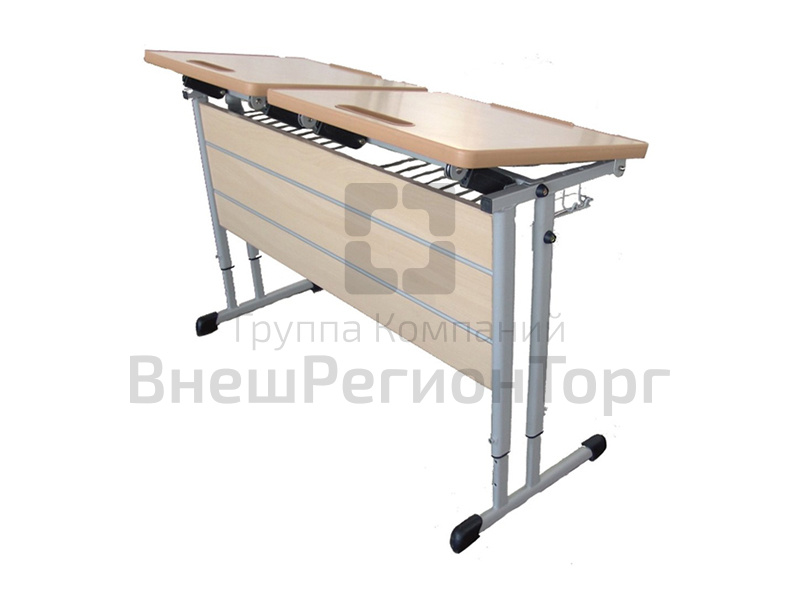 Стол ученический двухместный на плоскоовальной трубе. Оснащен двумя индивидуальными столешницами для каждого ученика с надежным 4-х позиционным механизмом регулировки угла наклона от 0 до 30 градусов. Цвета столешницы: береза, пепел, песок.