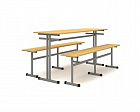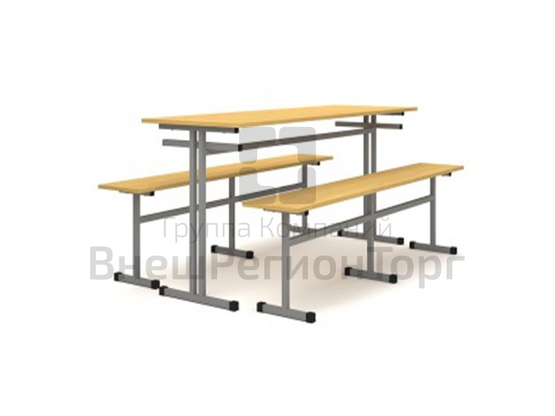 Стол обеденный 6-ти местный, оборудованный двумя подвесными скамьями. Каркас изготовлен из металлической трубы квадратного сечения 25х25 мм, с полимерно-порошковой окраской в светло-серый цвет. Столешница стола выполена из пластика 16 мм., сидение скамьи из ЛДСП 16 мм.