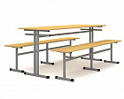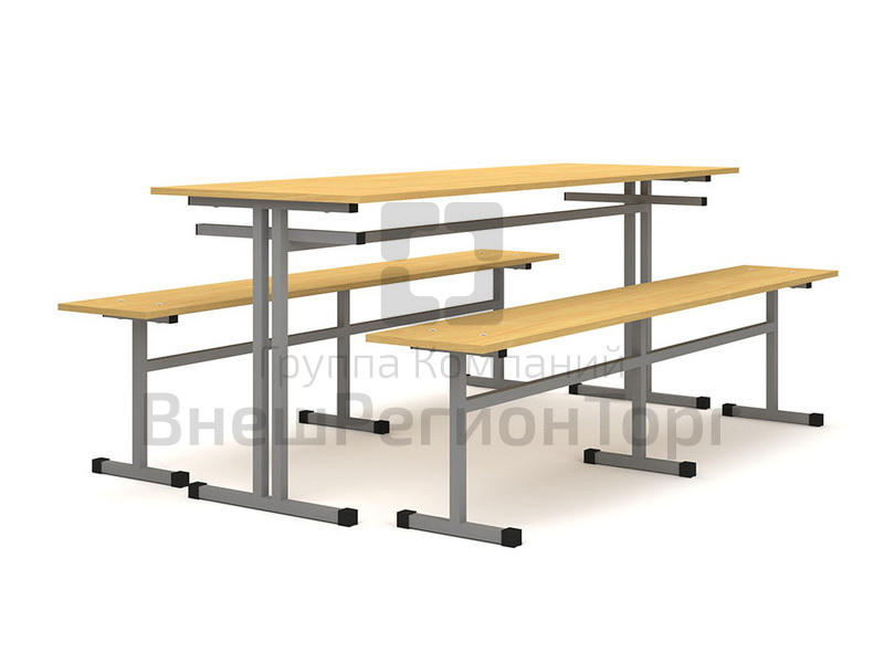 Стол обеденный 6-ти местный, оборудованный двумя подвесными скамьями. Каркас изготовлен из металлической трубы квадратного сечения 25х25 мм, с полимерно-порошковой окраской в светло-серый цвет. Столешница стола выполена из пластика 16 мм., сидение скамьи из ЛДСП 16 мм.