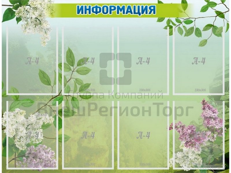 Стенд Информация предназначен для размещения в холле и коридоре учебных заведений. Модель выполнена в более веселом дизайне, с изображением веточек сирени и других весенних мотивов. Для листов с информацией на стенде имеются 8 карманов формата А4