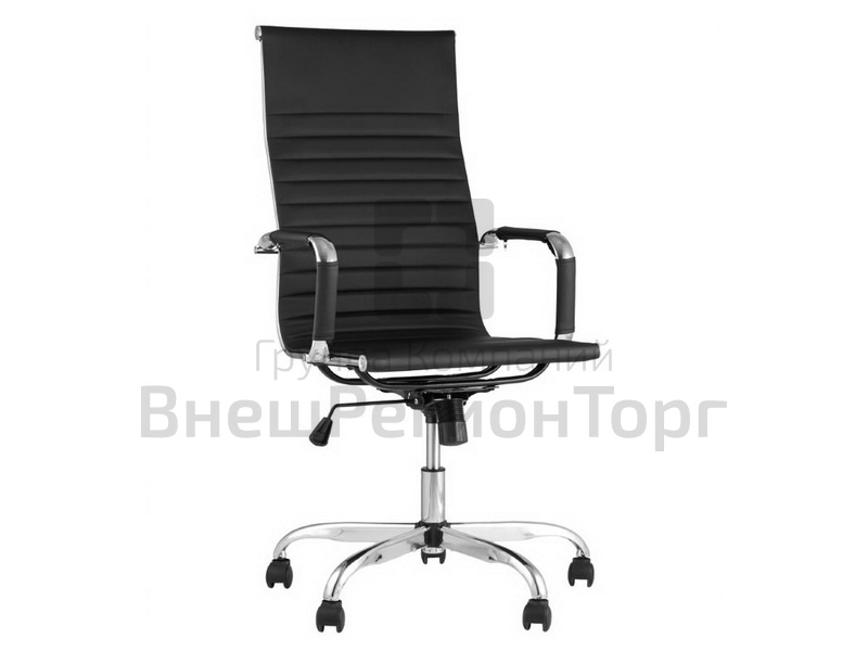 Современное, компактное и функциональное офисное кресло имеет регулировку по высоте и механизм качания, а высокая эргономичная спинка позволяет равномерно распределить нагрузку. Сиденье и спинка кресла изготовлены из экокожи. Этот же материал используется для чехлов на подлокотниках. Крестовина и подлокотники выполнены из хромированного металла.