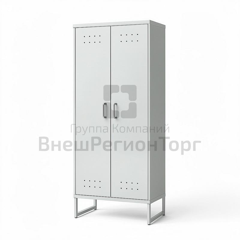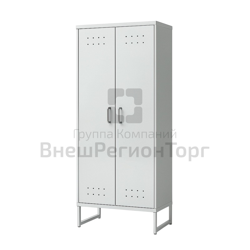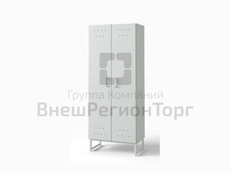 Корпус выполнен из листовой стали с эпоксиполиэфирным покрытием. Имеет два отделение, две дверки, по две полки (снизу и сверху) и крючки для одежды в каждом отделении.