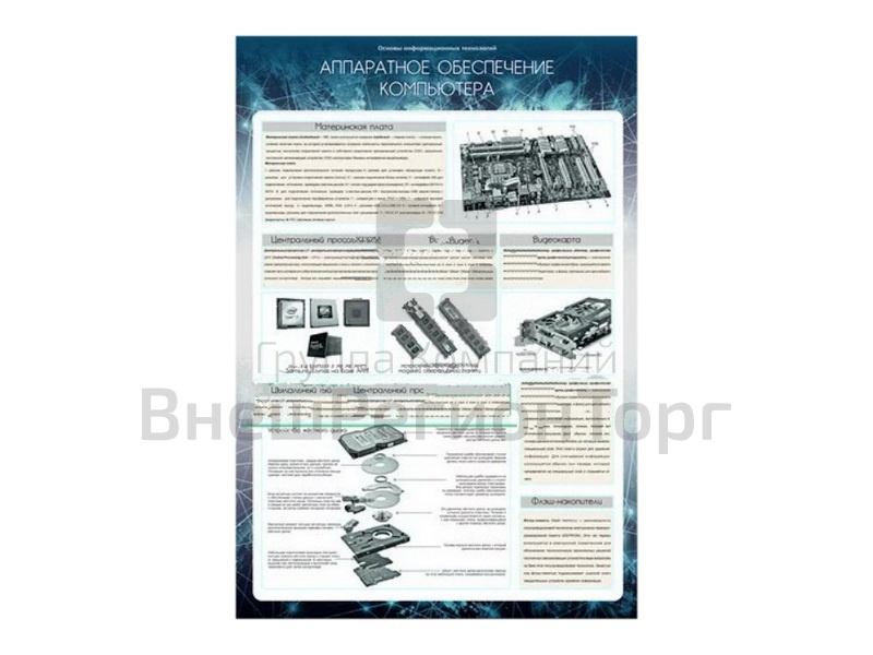 - Аппаратное обеспечение компьютера (материнская плата, центральный процессор, оперативная память, видеокарта, жесткие диски, оптические диски и оптические приводы, флэш-накопители)