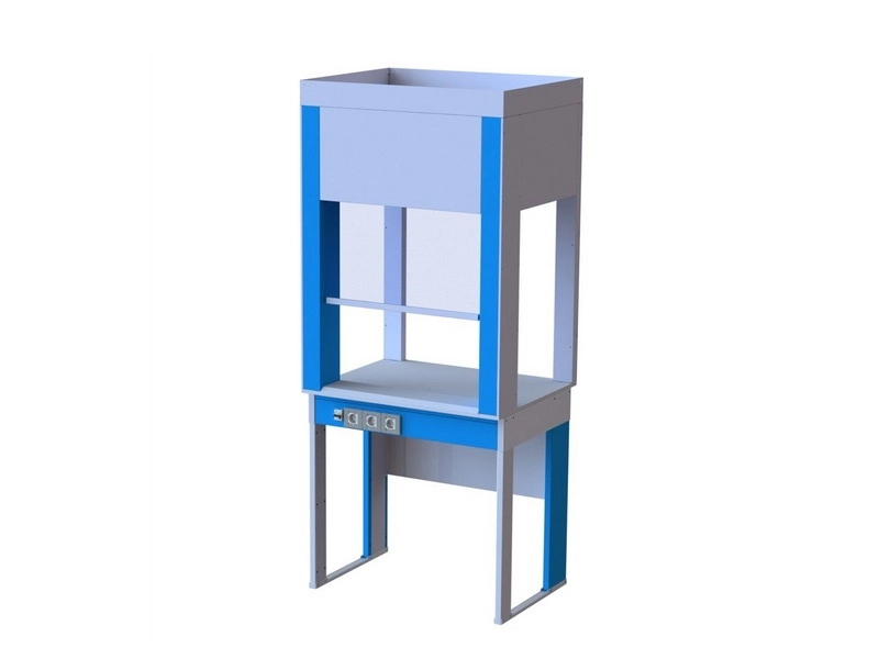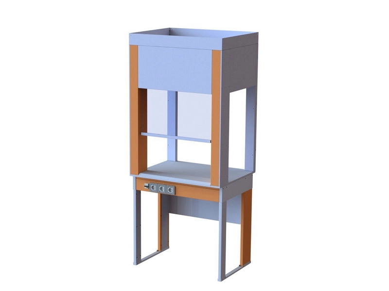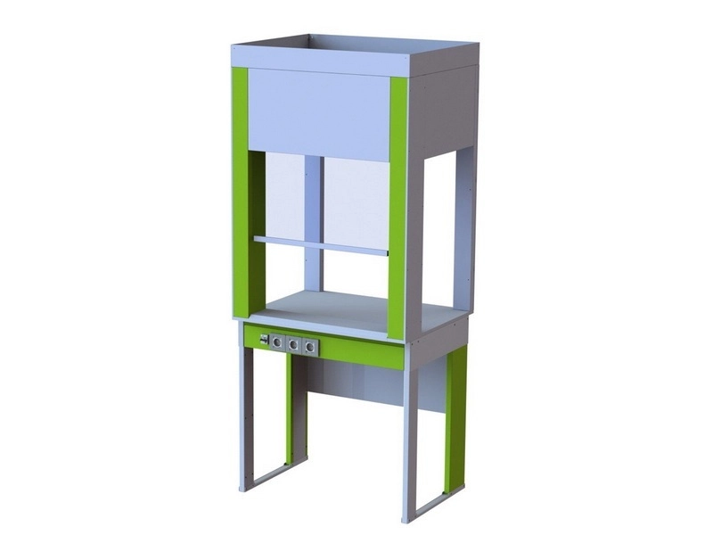 Конструкция вытяжного шкафа представляет собой сборно-разборный металлический каркас изготовленный из гнутого металлического листа, с использованием лазерной резки. Для компенсации неровностей пола вытяжной шкаф оснащен регулируемыми опорами 70 мм.