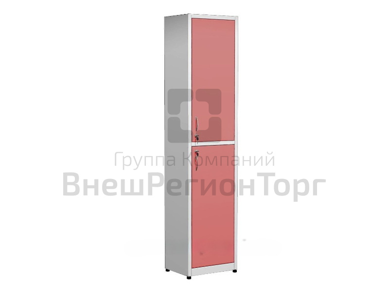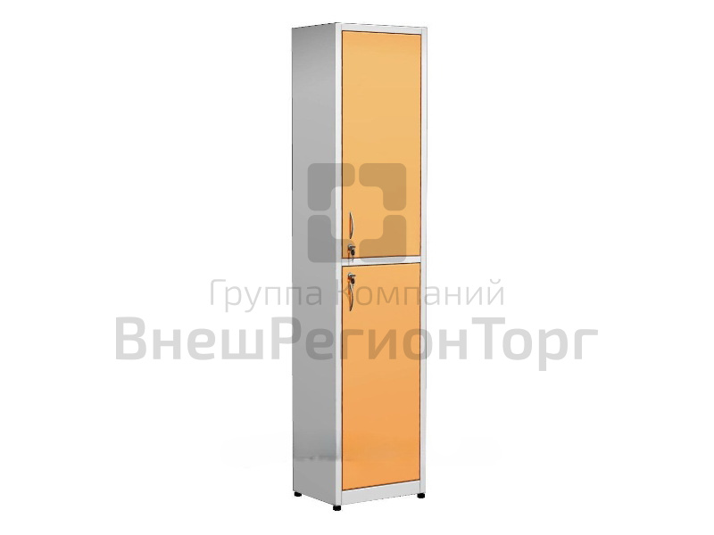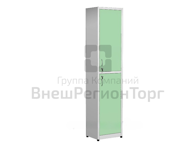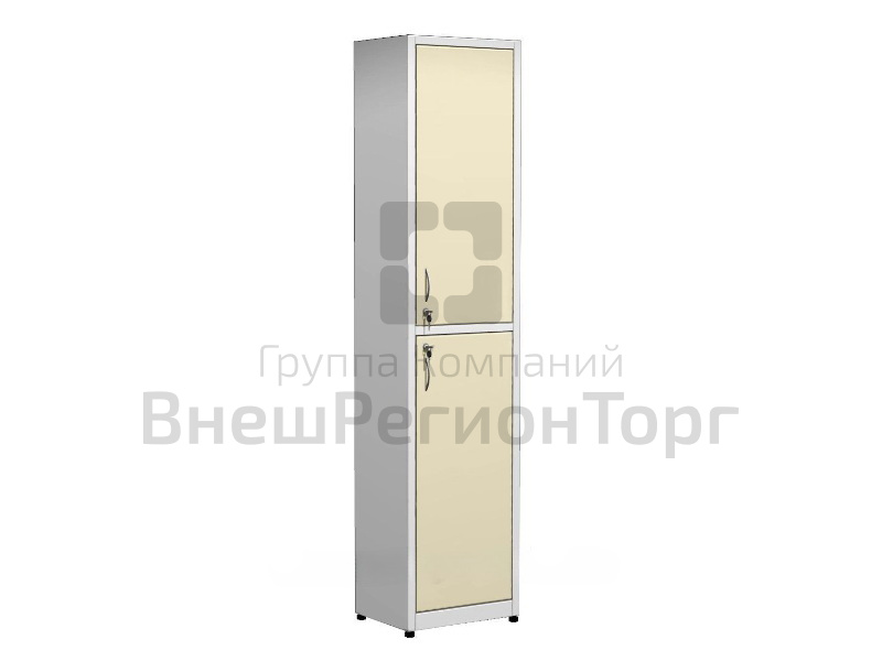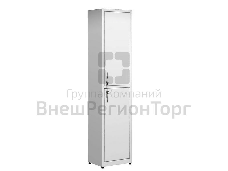 Шкаф: односекционный, одностворчатый. Наполнение верхней секции: дверка металл, ручка, замок, 2 регулируемые металлические полки. Наполнение нижней секции: дверка металл, ручка, замок, 1 стационарная металлическая полка. Опоры: винтовые, регулировка до 20 мм. Максимальная равномерно-распределенная нагрузка на металлическую полку: не более 15 кг.