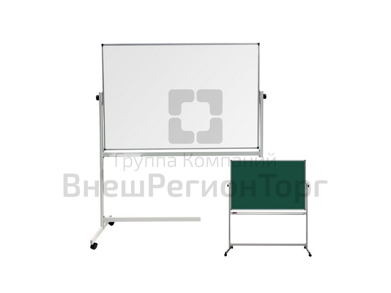 Поворотная передвижная магнитно-комбинированная доска имеет маркерную белую и меловую темно-зеленую поверхность на металлическом каркасе, окрашенном порошковым методом под цвет алюминия.