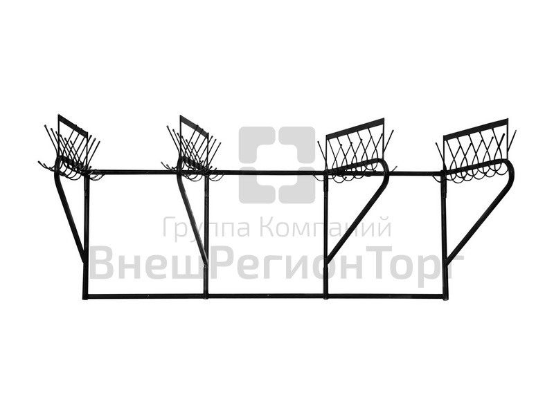 Особенности: Каркас стальной. Вешалка состоит из рамы и четырёх поворотных кронштейнов. На кронштейнах расположены 48 шляпных и 48 крюков для пальто (на каждом кронштейне 12+12 крюков). В базовую комплектацию входят декоративные пластиковые колпачки. Над крюками есть пластины для номеров.