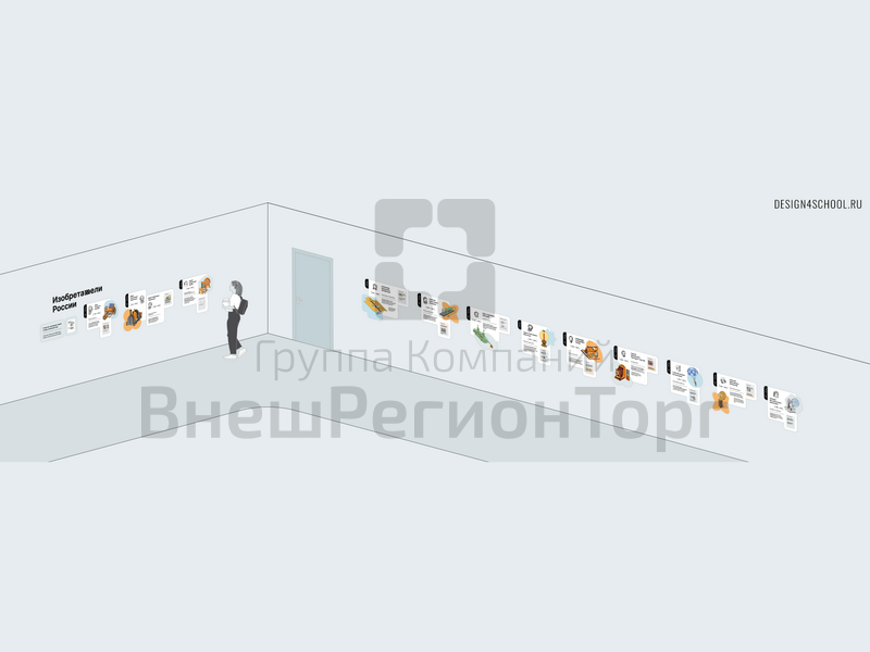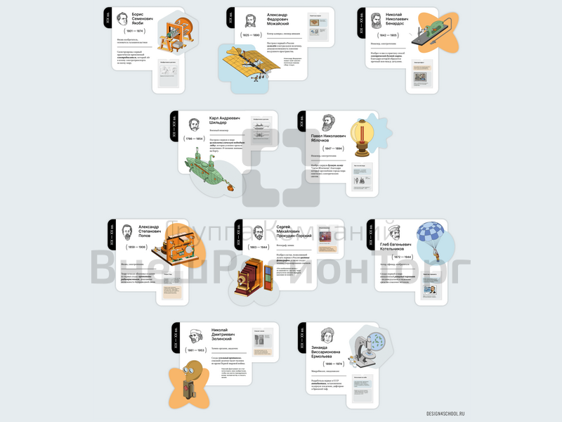 Авторские иллюстрации достоверно демонстрируют такие изобретения российских ученых как антибиотики, цветные фотографии, радиоприемник, подводную лодку (подводная лодка) и другие. В композициях дополнительно предусмотрены сценарии взаимодействия учеников и преподавателей с помощью встроенных интерактивных поверхностей (кармашки А4 для докладов и сменных QR кодов, маркерные поверхности, планшетами (планшеты) с зажимами и др).