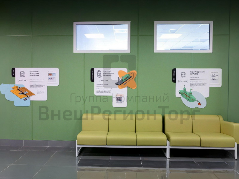 Авторские иллюстрации достоверно демонстрируют такие изобретения российских ученых как антибиотики, цветные фотографии, радиоприемник, подводную лодку (подводная лодка) и другие. В композициях дополнительно предусмотрены сценарии взаимодействия учеников и преподавателей с помощью встроенных интерактивных поверхностей (кармашки А4 для докладов и сменных QR кодов, маркерные поверхности, планшетами (планшеты) с зажимами и др).