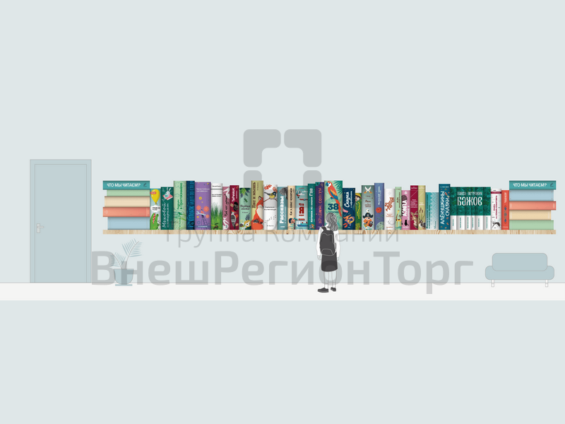 В книжной полке для начальной школы показаны корешки основных известных и популярных книг для младших школьников, выполненные в яркой, иллюстративной манере. По бокам полки размещены пустые корешки с нанесенной сверху маркерной пленкой — на этой поверхности можно писать и стирать.