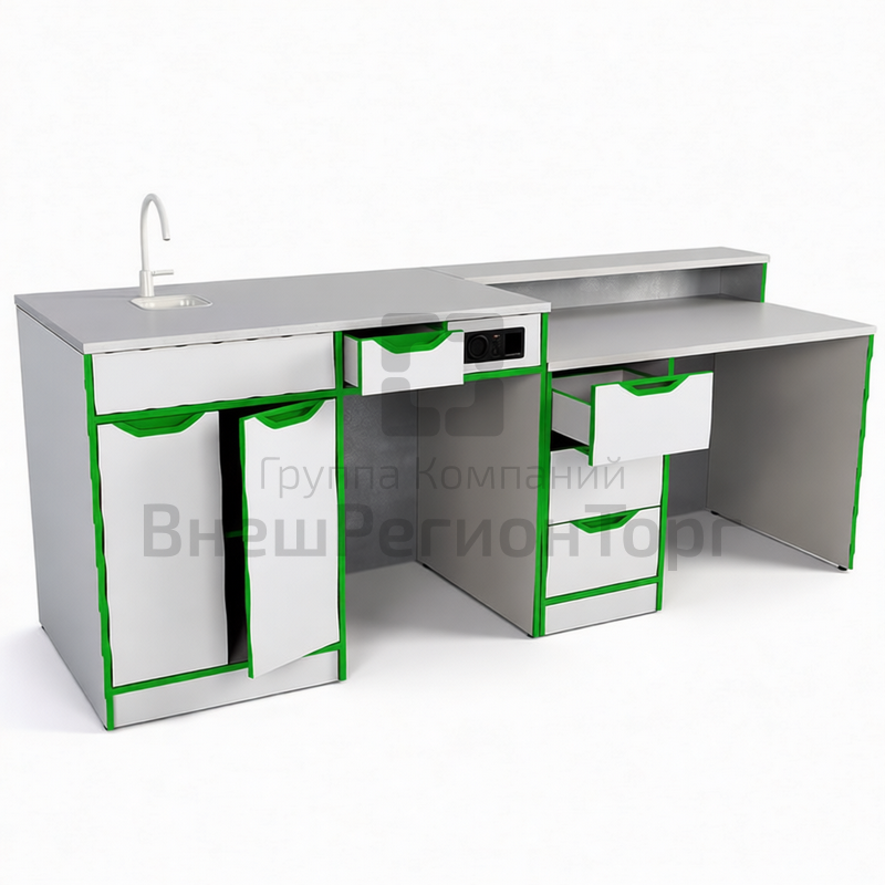 Стол лабораторный демонстрационный (с защитным, химостойким и термостойким покрытием, раковиной, подводкой и отведением воды, сантехникой, электрическими розетками, автоматами аварийного отключения тока)