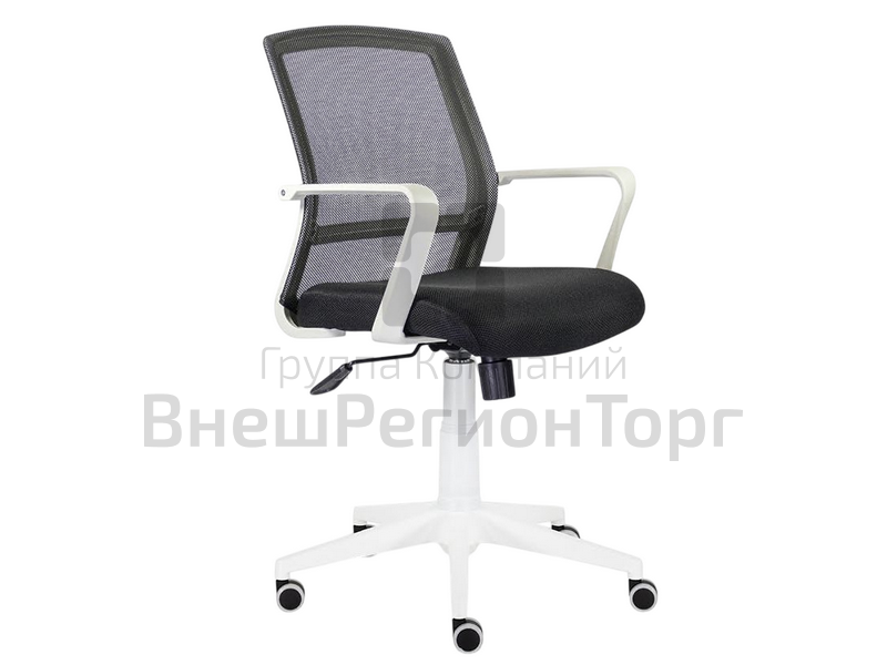 Кресло стоит на белой пластиковой крестовине, с максимальной нагрузкой 120 кг. Широкая эргономичная спинка обтянута прочной сеткой, пластиковые подлокотники белого цвета, соединенные с каркасом.