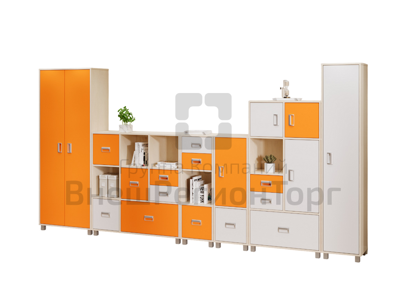 Размеры 3641х362х1846 мм. Материалы: Корпус - ЛДСП 16 мм Клён Танзай; Фасады - ЛДСП 16 мм Белый, Оранжевый.