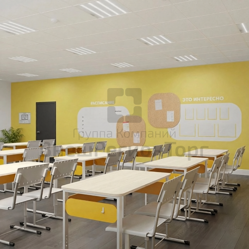 Ученическая зона с регулируемыми по высоте столами и эргономичными стульями для поддержки правильной осанки у разных возрастных групп. Рабочее место педагога с функциональным столом, мобильной тумбой и комфортабельным компьютерным креслом. Модульная система хранения и демонстрации, включающая стеллажи и шкафы разных типов (открытые, закрытые, с витринами). Это позволяет гибко организовать пространство, обеспечивая как открытый доступ к материалам, так и их защищенное хранение.