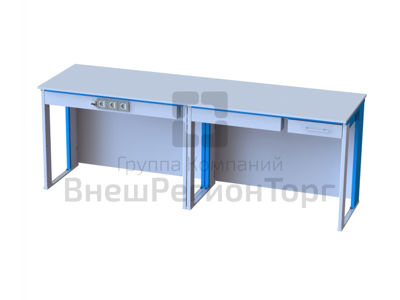 На передней части панели стол демонстрационного расположен электрический блок розеток 220 вольт, автомат аварийного отключения, выдвижной ящик. Возможна комплектация лабораторным краном и мойкой, навесными, встраиваемыми или подкатными тумбами, понижающим трансформатором на 42В и розетками на 42В.