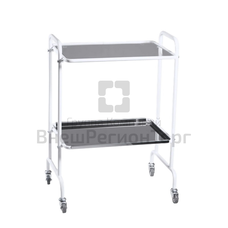 Столик имеет 2 полки: одна выполнена из стекла, другая съемная — из нержавеющей стали, размеры — 580x420 мм. По бокам располагаются прямоугольные ручки для удобства перемещения.