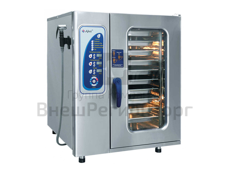 панель управления на русском языке, таймер до 10 часов, трехканальный температурный щуп, система регулировки влажности (от 0 до 100%), поддержание температуры в камере +/- 1°С, 5 скоростей вращения вентилятора, встроенная система охлаждения слива, душ для мойки, вентилируемая дверь духовки, двухходовой механизм открывания дверки, система закрывания двери "свободные руки", полуавтоматическая мойка.