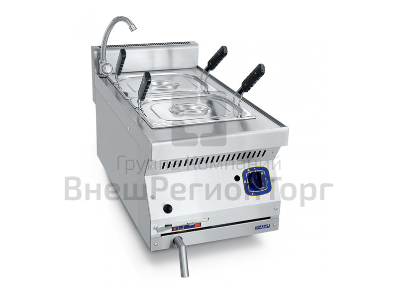 Удобные ручки позволяют быстро и безопасно вынимать корзины с готовыми продуктами из воды. Регулируемые по высоте ножки. Слив воды осуществляется из крана, расположенного на передней панели газоварки.
