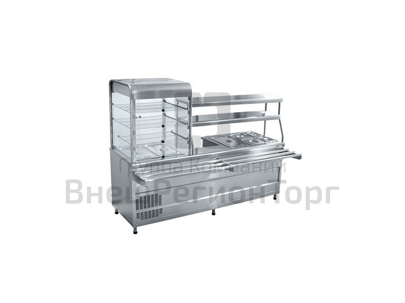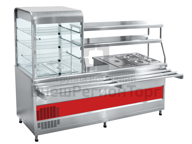 Имеет одну конфорку для наплитной посуды, паровую ванну на 8 литров с набором гастроемкостей для вторых блюд и охлаждаемую витрину с набором гастроемкостей для хранения салатов. Внутренний объем закрытой витрины имеет принудительную циркуляцию охлажденного воздуха с плавной регулировкой температуры от 5 до 15°С, три полки-решетки и лампу подсветки. Хладагент: R404A. Способ обогрева гастроемкостей мармитной части - горячим паром. Плавная регулировка температуры от 30 до 85°С за 25мин. Двойная полка над мармитной частью прилавка оснащена лампой подсветки. Мармит первых блюд - одна конфорка (регулировка мощности конфорки-3-х позиционным пакетным переключателем). Внизу - нейтральный шкаф для хранения кухонного инвентаря. Гастроёмкости(7штук: 3хGN 1/1x150, 2хGN1/2x150, 2хGN 1/4x150), регулируемые по высоте ножки и направляющие для подносов входят в комплект поставки.