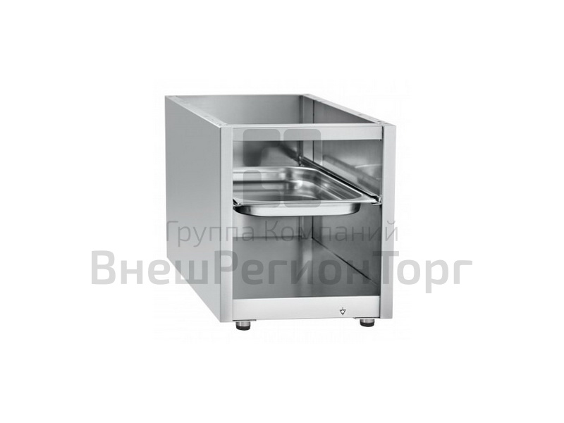 Открытая с лицевой стороны нижняя полка. Направляющие для двух гастроемкостей размером GN 1/1. Регулируемые по высоте ножки.