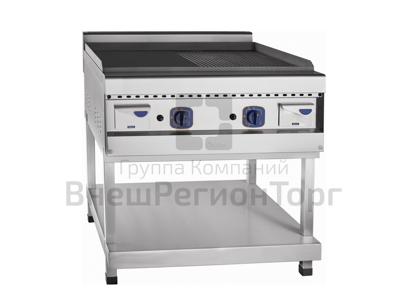 Работает как на природном, так и на сжиженном газе. Жарочная поверхность 834х703 мм имеет одну половину с гладкой поверхностью, другую с рифленой. Двухступенчатая регулировка мощности нагрева жарочной поверхности. На лицевой панели расположены лотки для сбора масла. В комплекте съемные форсунки под сжиженный газ. Пьезорозжиг.