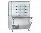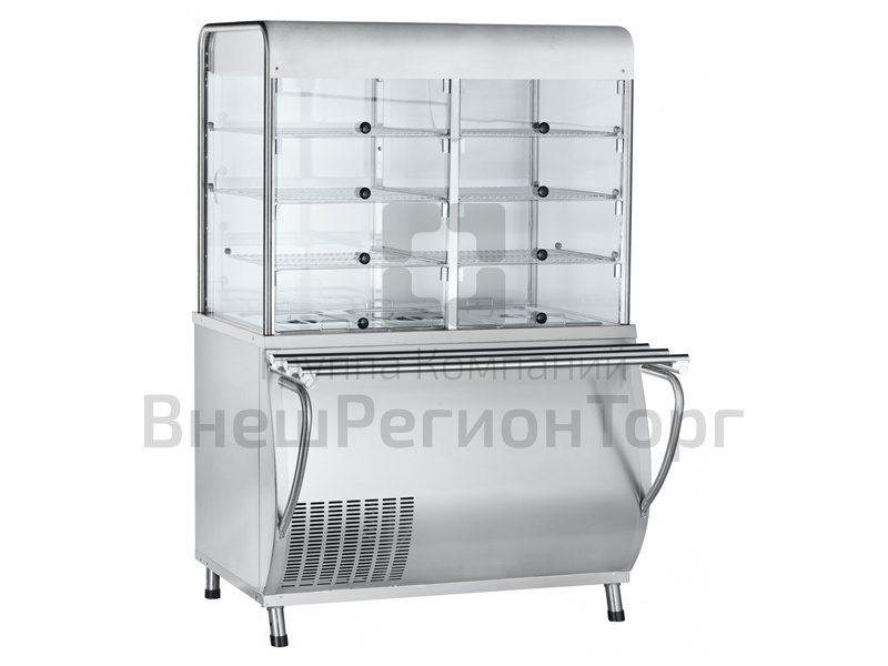Закрытая охлаждаемая витрина имеет большую полезную площадь для выкладки блюд и напитков. Внутренний объем витрины имеет принудительную циркуляцию охлаждаемого воздуха и лампу подсветки. Основание витрины представляет собой охлаждаемую углубленную столешницу с набором гастроемкостей для хранения салатов. Внизу нейтральный шкаф для хранения кухонного инвентаря.