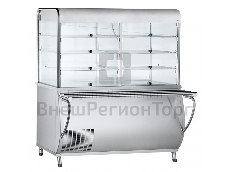 Закрытая охлаждаемая витрина имеет большую полезную площадь для выкладки блюд и напитков. Внутренний объем витрины и камеры имеют принудительную циркуляцию охлажденного воздуха. Витрина имеет лампы подсветки.