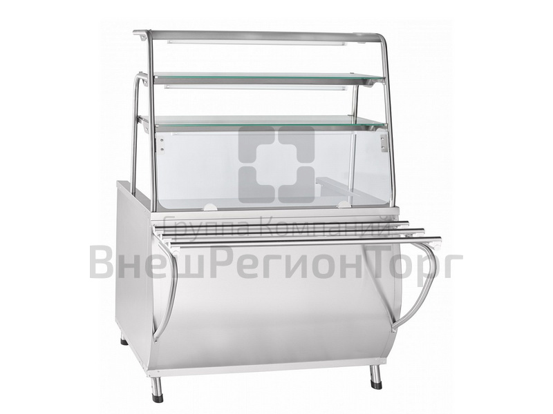 Прилавок имеет две конфорки, три полки с подсветкой, регулируемые по высоте ножки. Направляющие для подносов входят в комплект поставки.