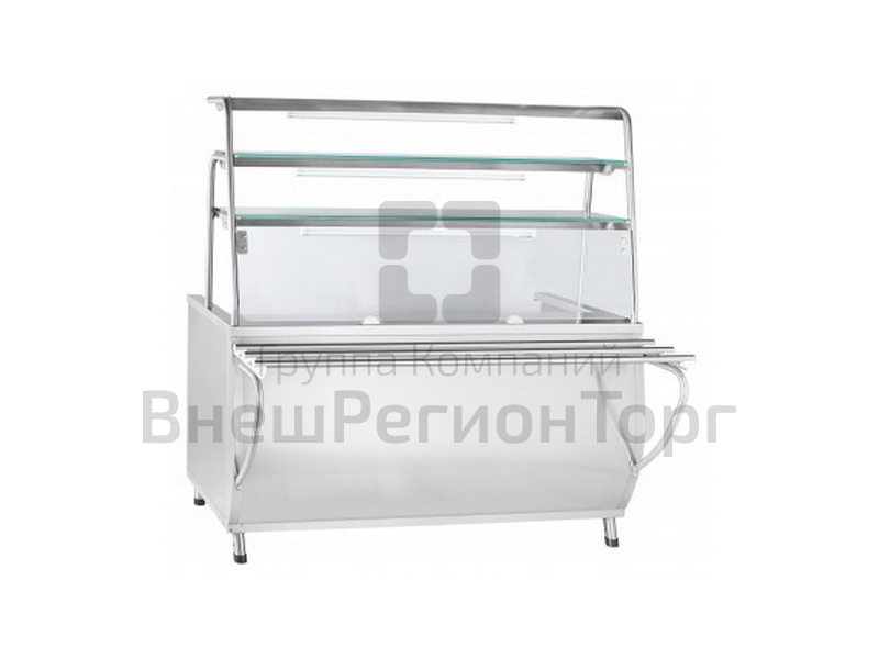 Прилавок имеет три конфорки, три полки с подсветкой, регулируемые по высоте ножки. Направляющие для подносов входят в комплект поставки.