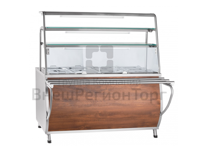 Над мармитом три полки с подсветкой. Ножки регулируются по высоте. Направляющие для подносов в комплекте.