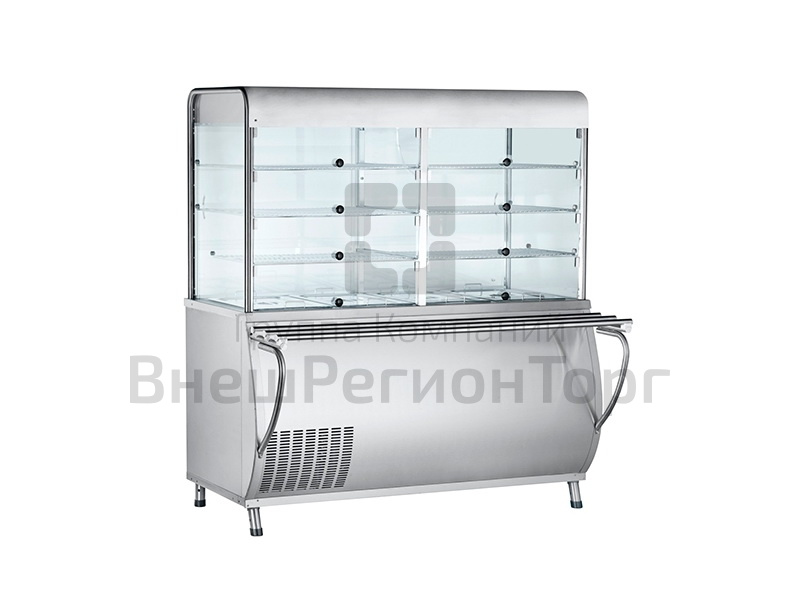 Плавная регулировка температуры 1...10°С. Хладагент: R404A. Внутренний объем закрытой витрины имеет принудительную циркуляцию охлажденного воздуха и 2 лампы подсветки. Демонстрационная площадь охлаждаемой ванны 0,69 м2, полкок: 2,07 м2. Внизу - нейтральный шкаф.