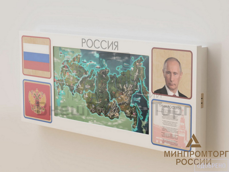 Настенная интерактивная панель с сенсорным монитором, декорированная основной символикой РФ: герб, флаг, гимн, портрет президента. Разработана для реализации программы патриотического воспитания в школе, детском саду или других образовательных учреждениях. Подходит для оформления входной зоны и классов. Соответствует требованиям ФГОС 3.