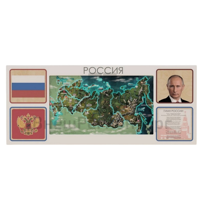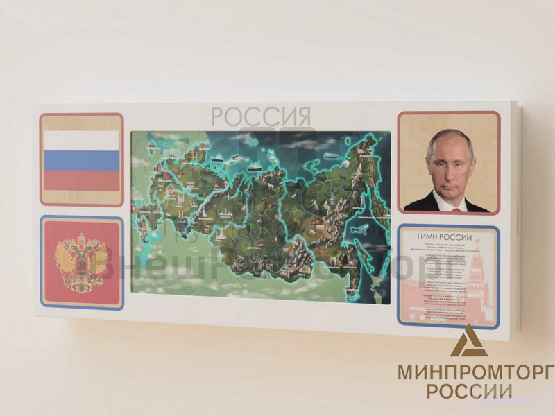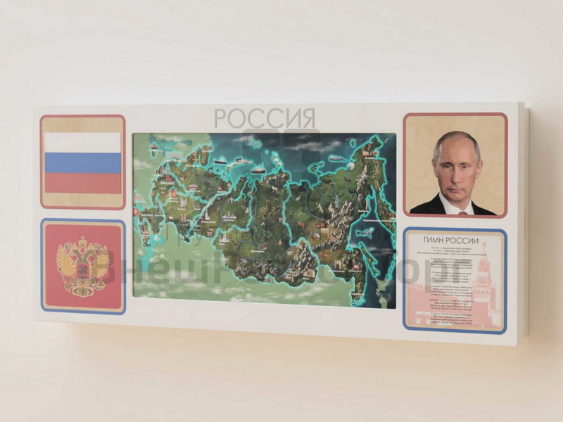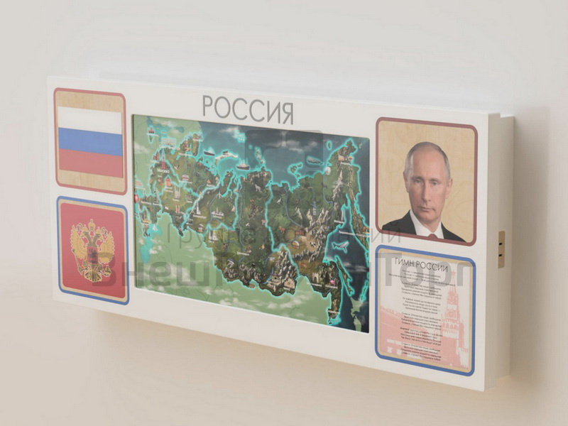 Настенная интерактивная панель с сенсорным монитором, декорированная основной символикой РФ: герб, флаг, гимн, портрет президента. Разработана для реализации программы патриотического воспитания в школе, детском саду или других образовательных учреждениях. Подходит для оформления входной зоны и классов. Соответствует требованиям ФГОС 3.