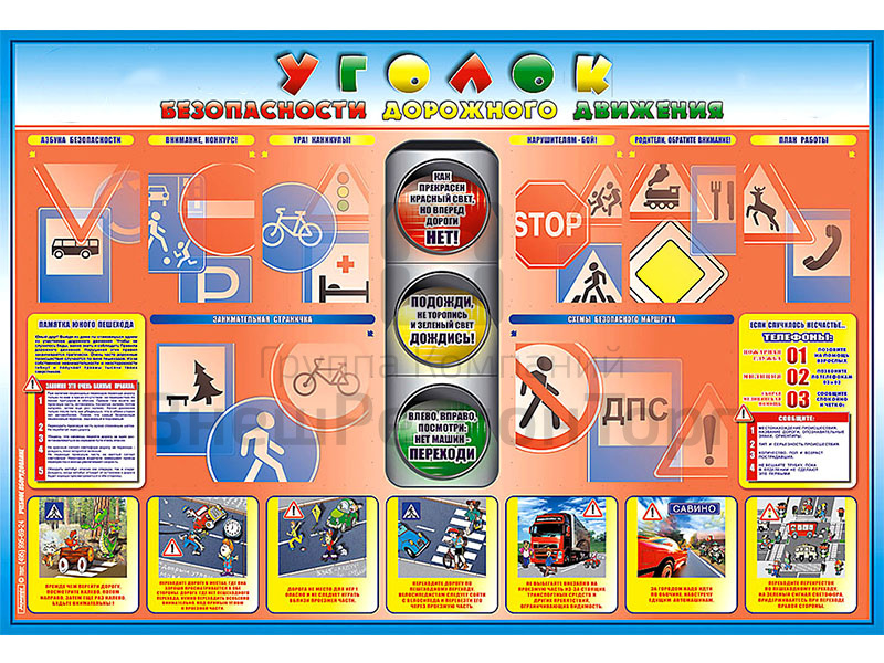 Стенд представляет собой информационную панель, на которой размещены правила безопасного поведения на дороге для юных участников дорожного движения, а также 6 "карманов" формата А4 и 2 "кармана" формата А3.
