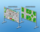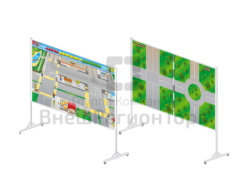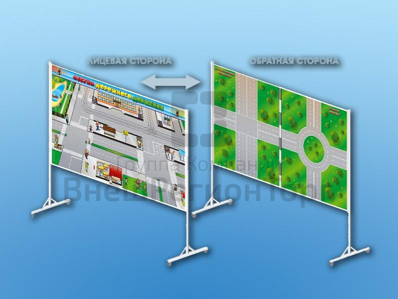 Двухсторонняя магнитно-маркерная доска представляет собой информационную панель на стойках, на лицевой стороне которой изображена "Азбука дорожного движения", а на оборотной – четырехсторонний перекресток и круговое движение.
