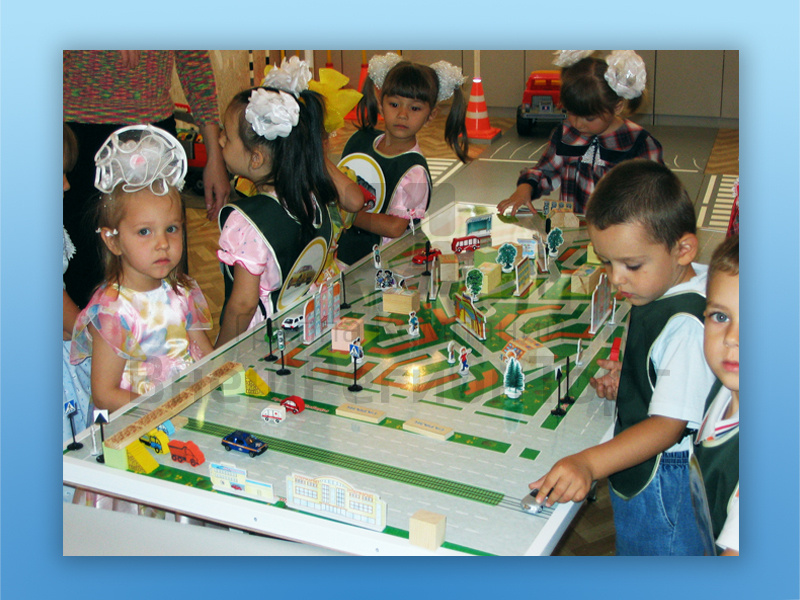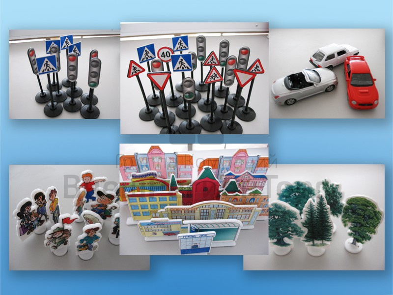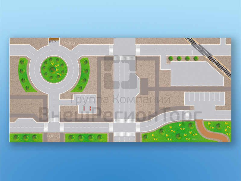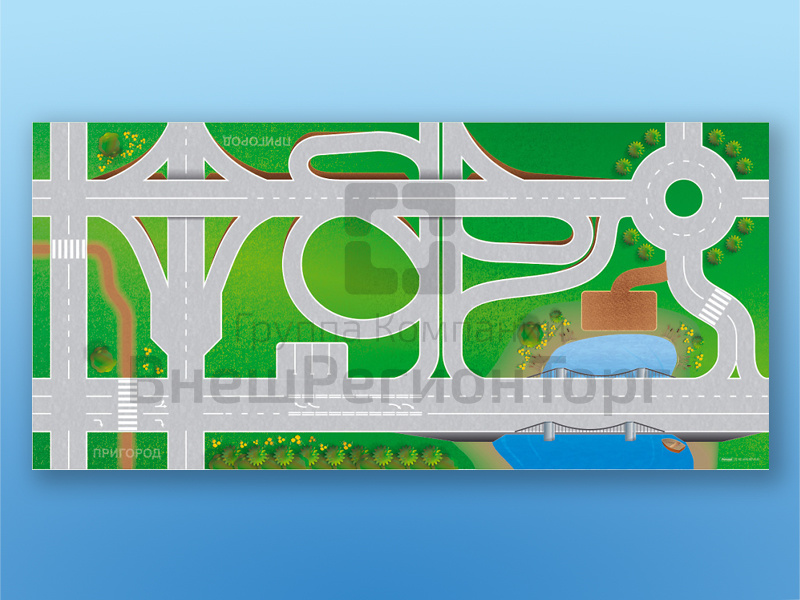 Настольно-напольная игра представляет собой макет, состоящий из трех магнитно-маркерных панно, на которых изображена городская инфраструктура, пригород и автогородок.