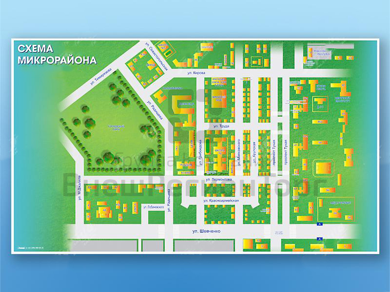 Магнитно-маркерная доска представляет собой информационную панель, на которой изображена схема микрорайона города (по желанию заказчика), включая проезжую часть, трамвайные пути, перекрестки, пешеходные переходы, остановочные площадки и объекты социальной инфраструктуры.