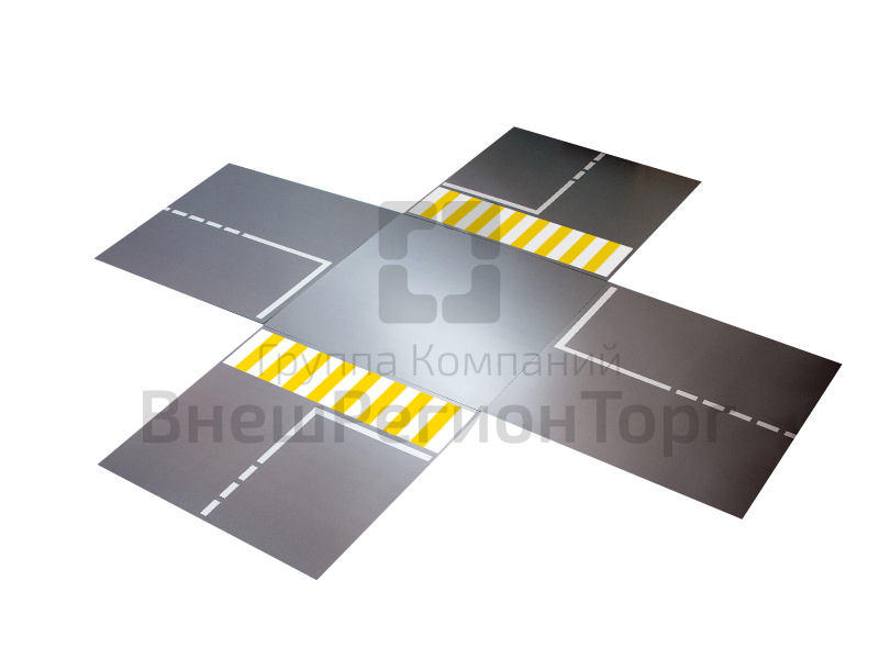 Четырехсторонний перекресток представляет собой демонстрационную модель перекрестка, состоящую из пяти секций, на которых изображена проезжая часть с линиями дорожной разметки и пешеходными переходами.