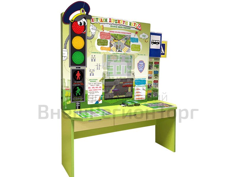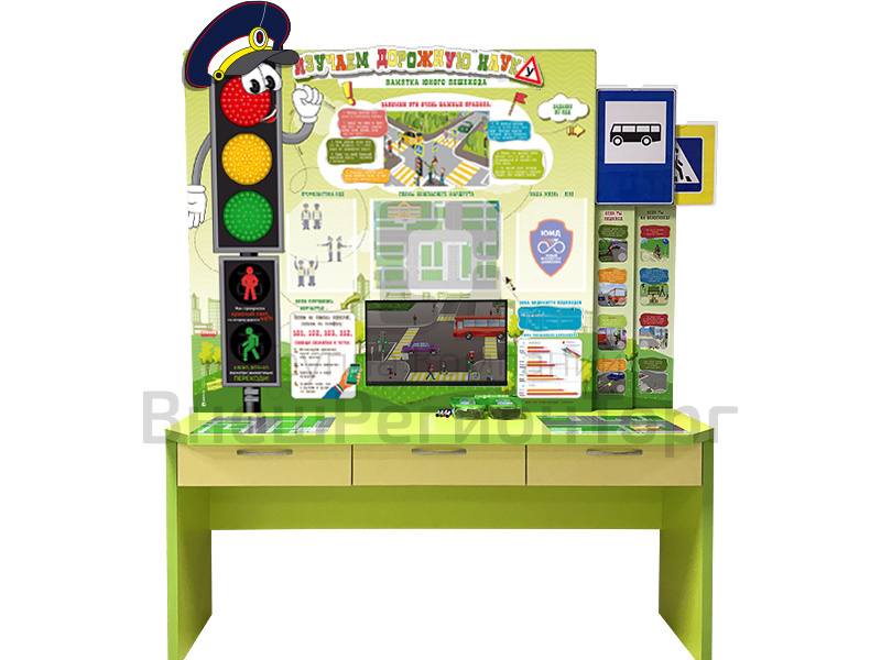 Основу комплекта составляет учебно-лабораторный стол с интегрированным в него учебным оборудованием. На передней панели стола установлен стенд "Уголок безопасности дорожного движения". На стенде размещены сведения о сигналах светофора, памятка юного пешехода, телефоны экстренных служб, а также карманы для размещения сменной информации: "План мероприятий по профилактике БДД", "Наша жизнь - ЮИД", "Знай, помни, соблюдай!", "Статистика аварийности", "Ловушки" на дорогах", "Погода сегодня", "Схемы безопасного маршрута". В центральной части стола расположен аппаратно-программный комплекс с сенсорным ЖК-дисплеем, на котором отображается мультимедийный обучающий материал. На поверхности стола расположены маркерные поверхности с изображением схем дорожного движения. В выдвижных элементах стола имеется автомобильная аптечка.
