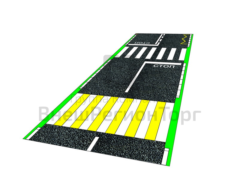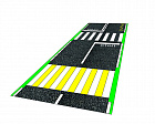 - Имитация проезжей части - 1 шт. Размер: 2000 х 5000 мм. Материал: плотная баннерная ткань на поверхность которой типографским способом наносится полноцветная печать с изображением элементов проезжей части, включая тротуар, разметку пешеходного перехода, автобусной остановки.