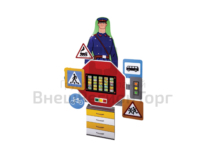Яркий внешний вид интерактивного комплекса-тренажера привлечет детей младшего возраста. Оборудованный дорожными знаками и рабочим светофором, сенсорный модуль настраивает на обучение в игровой форме и вызывает интерес у всех юных исследователей. Для изучения правил дорожной безопасности, на встроенном компьютере с экраном диагональю 23,6 дюйма установлено программное обеспечение. На сенсорном экране отображаются игры для интерактивного обучения.